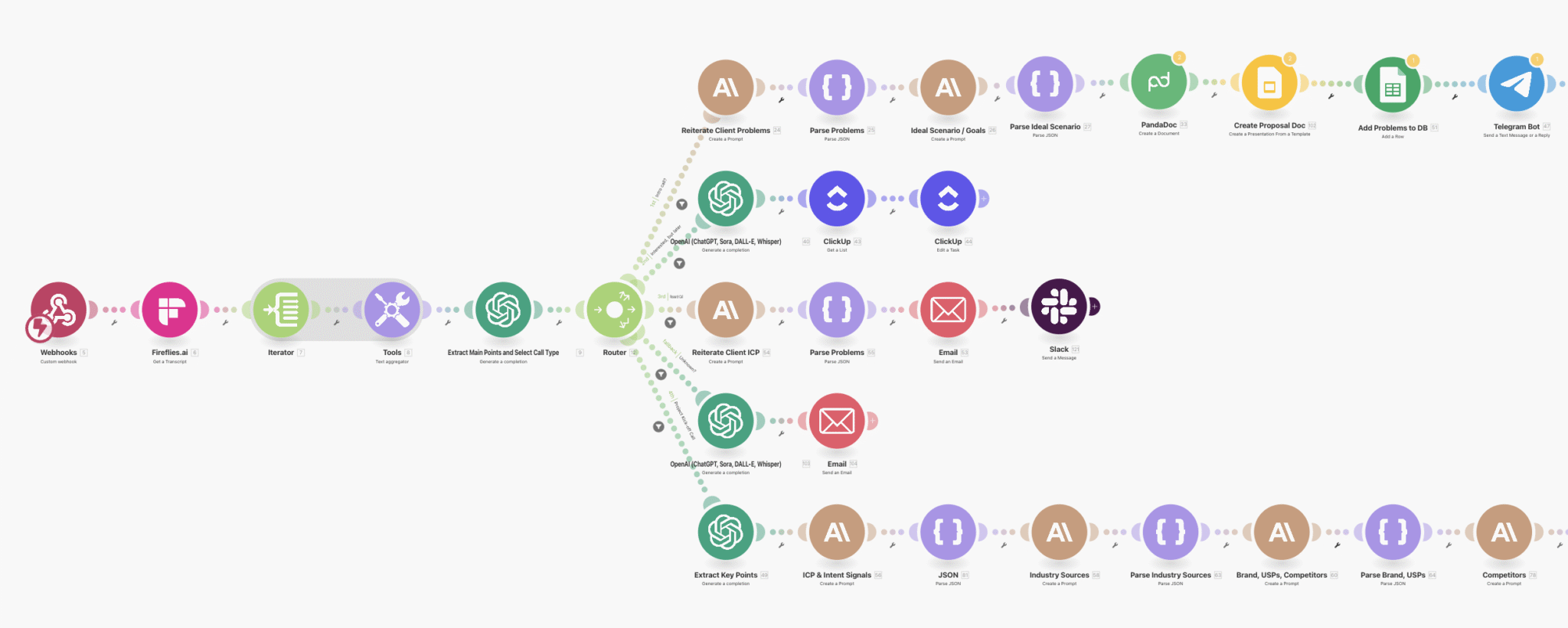 After every call, someone on your team is re-listening to recordings, pulling out action items, writing proposals, chasing for feedback, making revisions, managing follow ups. This automation transcribes your calls, categorises it, generates tailored proposals with the exact points discussed, handles follow-ups and revisions, adds tasks to a PM tool, updates CRM in minutes.